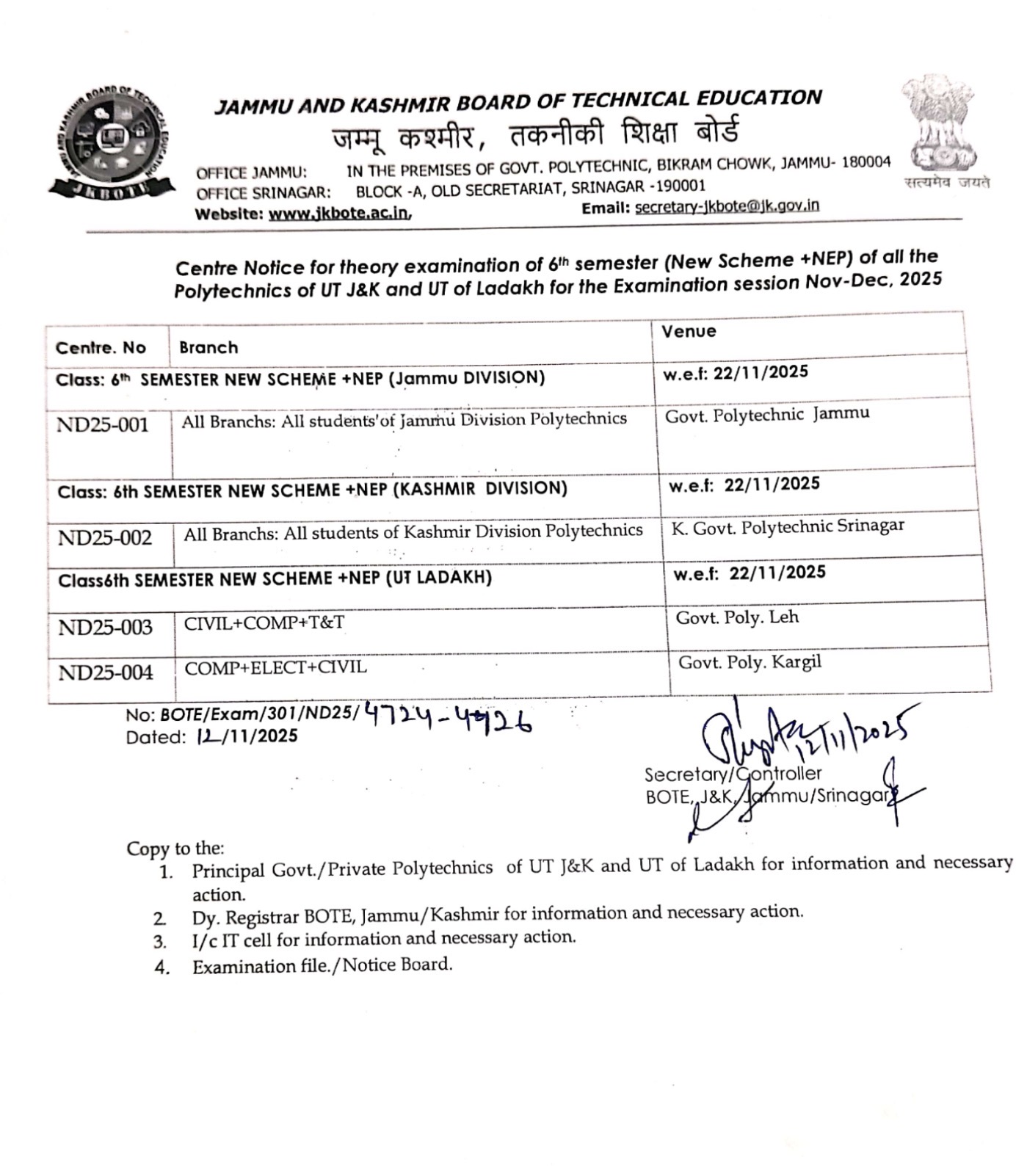 JKBOTE Issues Centre Notice for 6th Semester: The Jammu and Kashmir Board of Technical Education (JKBOTE) has released the official centre notice for the 6th Semester Theory Examination under the New Scheme + NEP for all Government and Private Polytechnics of UT of J&K and UT of Ladakh.
